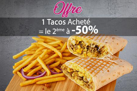 Tortilla servie avec sauce fromagère et garnie de frites à l'intérieur + 2 Viandes au choix + 1 Boisson 33cl au choix.